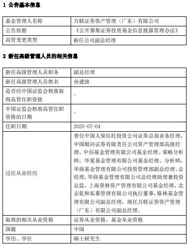 中国经济网北京7月8日讯近日,万联证券资产管理(广东)有限公司公告,任命孙建波为副总经理。